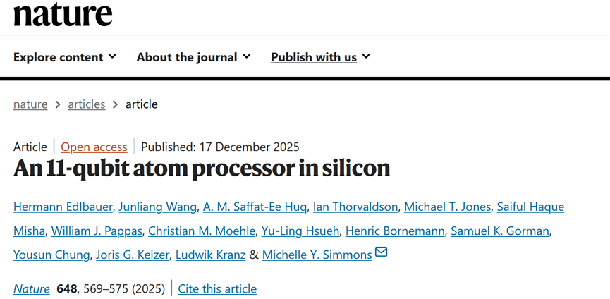 近日,硅量子计算有限公司(Silicon Quantum Computing Pty Ltd)和新南威尔士大学Michelle Y. Simmons团队在Nature上发表了题为“An 11-qubit atom processor in silicon”的论文,该研究构建了一种基于硅中精确排布磷原子的11比特原子量子处理器,通过电子交换相互作用实现多个核自旋寄存器的高保真非局域纠缠,验证了单比特与多比特量子门及多体纠缠态的高性能运行,为可扩展、容错量子计算奠定了基础。