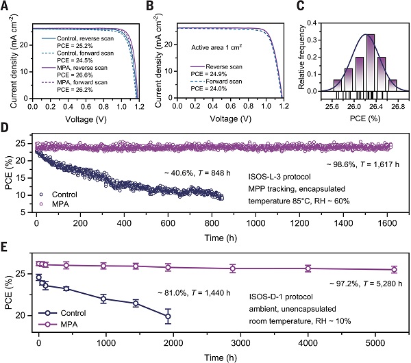 基于此,厦门大学张金宝教授、杨丽助理教授与西安交通大学梁超教授联合在Science上发表了题为“Molecular press annealing enables robust perovskite solar cells”的论文,提出一种全新的分子压印退火(molecular press annealing, MPA)策略—在退火过程中使用一层2-吡啶乙胺功能分子贴合钙钛矿表面,模拟分子尺度的“压力机”,在退火过程中实时修复碘空位缺陷,并通过优化配体工程稳定铅-碘框架结构,从而增强钙钛矿薄膜的结构完整性与长期稳定性。基于该策略的n-i-p型钙钛矿太阳能电池实现了26.6%的功率转换效率(认证效率26.5%)。值得注意的是,在最大功率点持续运行条件下,器件经过1617小时仍保持初始效率的98.6%(ISOS-L-3标准,85℃,60%相对湿度RH);在环境储存5280小时后仍保持初始效率的97.2%(ISOS-D-1标准,室温,10%RH)。此外,MPA策略在多种钙钛矿体系中展现出广泛的普适性,并具备高度的可重复使用性—单个吡啶基模板可实现数十次压印循环,与传统溶液法后处理工艺相比,成本降低了超过47倍。