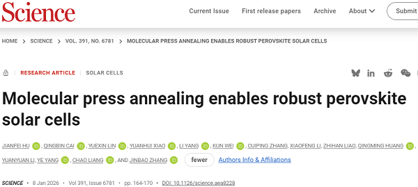 原文详情:Molecular press annealing enables robust perovskite solar cells (Science 2026, 391, 164-170)