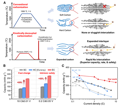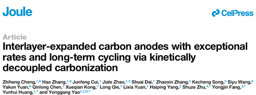 姚永刚教授、黄云辉教授、方永进教授、朱书泽教授团队提出了一种基于瞬态高温的动力学解耦碳化策略,即从精确的前驱体结构到精细的碳化过程控制再到准确的碳结构,可控制备了膨胀碳基负极材料,显著提高了钠离子电池负极的容量、倍率和循环稳定性。