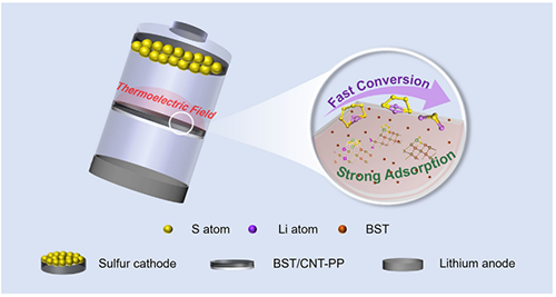 华中科技大学黄云辉、武汉理工大学赵文俞设计了一种 Bi0.5Sb1.5Te3/碳纳米管(BST/CNT)夹层,通过提供广泛的吸附位点和从 BST 热电材料产生的热电场来增强Li-S电池的耐久性。