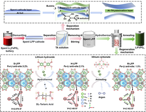 华中科技大学袁利霞教授/黄云辉教授团队通过酒石酸(TA)基水热处理和短暂退火克服了这些挑战,通过促进Li+沿晶体结构的[010]晶向重新嵌入,成功实现了LFP的再生。