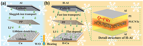 华中科技大学黄云辉教授、许恒辉教授团队创新性设计了一种多层复合集流体结构:核心为聚酰亚胺/碳纳米管(PI/CNTs)焦耳加热层,该加热层置于两层绝缘聚酰亚胺层中间,最外层磁控溅射两层高导电性的导电金属涂层。