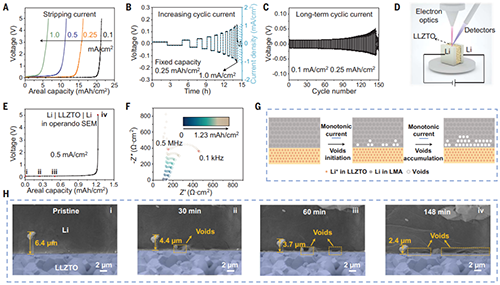 华中科技大学黄云辉和同济大学罗巍团队通过原位扫描电子显微镜(SEM)和相场模拟等技术,揭示了固态锂金属电池(SSBs)失效与锂金属阳极(LMA)疲劳之间的密切关系。研究发现,锂金属阳极在电化学循环过程中会经历疲劳现象,这种疲劳现象遵循力学中的Coffin-Manson方程,表现为锂金属内部逐渐产生微孔和裂纹,最终导致界面退化和电池失效。