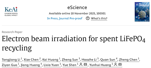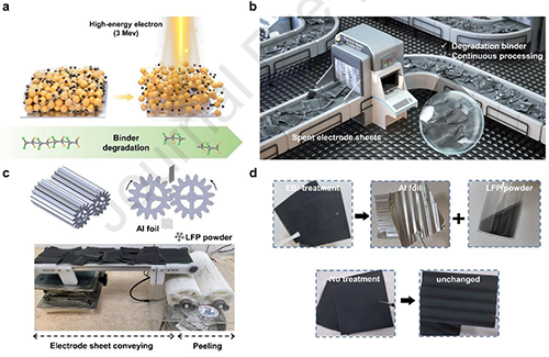 黄云辉、沈越团队提出一种基于电子束辐照(EBI)的磷酸铁锂(LiFePO4,LFP)直接回收策略。电子束辐照可选择性降解聚合物粘结剂,使磷酸铁锂能从集流体上高效剥离。