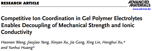 14. Advanced Materials:凝胶聚合物电解质竞争性离子配位策略以实现机械强度与离子电导率解耦
