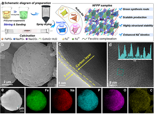 华中科技大学黄云辉(国家杰青/长江学者)、方淳团队与长江大学徐月(原团队成员)提出创新方案——通过调控合成过程中铁价态,在不引入杂原子的情况下优化 NFPP 局部结构,所得非化学计量比 NFPP-2(Na4.024Fe2.921(PO4)2P2O7)让惰性 Na2位点有序排列成 “结构支柱”,脱钠时晶格体积仅变化 4.18%,大幅提升结构稳定性。