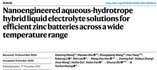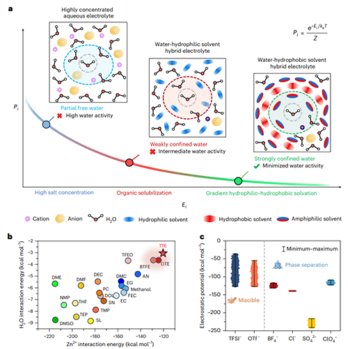 华中科技大学黄云辉教授、香港城市大学支春义教授、浙江大学范修林教授、中国科学院高能物理研究所散裂中子源科学中心简宏希(wang hay kan)和同济大学罗巍教授合作,提出了一种纳米工程策略,通过构建亲水-疏水梯度水合鞘层来限制水分子活动。该团队将疏水性氢氟醚与氟化醇类水溶物分子引入锌盐电解液中,形成了独特的“水纳米限域”结构。