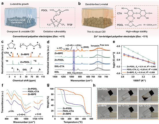 华中科技大学黄云辉、许恒辉团队提出了一种通过非锂金属离子与醚氧之间的桥接来显著提高聚醚电解质氧化稳定性的通用方法。为了证明离子桥接策略的可行性,制备了一种锌离子桥接的聚醚电解质(Zn-IBPE),其电化学稳定性窗口超过5V,能够在4.5V的锂金属电池中实现良好的循环稳定性。