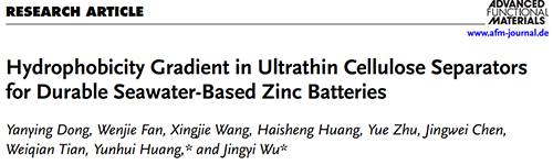 25. Advanced Functional Materials:超薄纤维素隔膜疏水性梯度以实现长效海水基锌电池