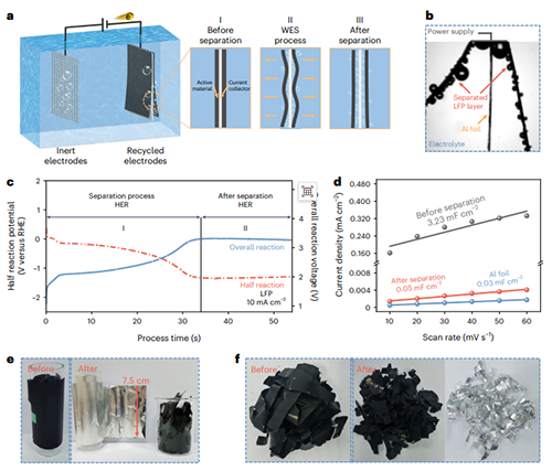 同济大学王超课题组联合黄云辉和李巨教授提出了一种水电解诱导分离方法,利用H2或O₂气体鼓泡高效分离电极材料与集流体。该方法在10 mA cm–2的电流密度下,仅需34秒即可实现磷酸铁锂(LiFePO4)99.5%的材料回收率(金属杂质含量<40 ppm),而石墨的分离时间仅需3秒,能耗极低(分别为11 kJ·kg–1和1.1 kJ·kg–1)。