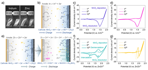 华中科技大学黄云辉、同济大学傅婧团队报道了一种酸性铟—MnO2电池(IMB)体系,通过阴离子调控界面化学实现阴负极处的可逆沉积-溶解反应。铟(In)的In3+/In氧化还原对具有更正的标准还原电位(–0.34 V vs. 标准氢电极),能够减少酸性介质中的寄生副反应。
