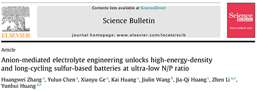 20. Science Bulletin:阴离子介导电解液工程解锁高能量密度与长循环寿命的超低N/P比硫基电池