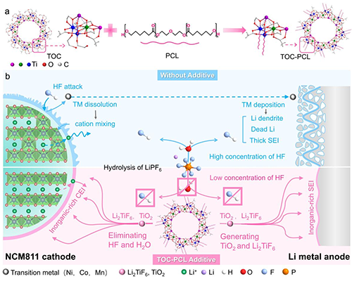 华中科技大学黄云辉教授的指导下,和裴非副研究员带领研究团队提出将聚己内酯二醇修饰的钛氧簇(TOC-PCL)用作多功能电解液添加剂,以调控高镍正极与锂负极的界面化学。电解液中的微量H2O 和HF通过TOC-PCL的水解作用被有效清除,随后在循环过程中原位构建出富含无机成分(TiO2、Li2TiF6和LiF)的稳定电极-电解质界面,大幅抑制了界面化学侵蚀。