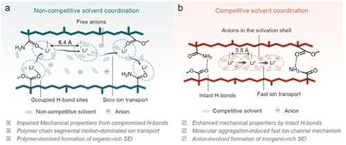 华中科技大学黄云辉、许恒辉团队在基于含氢键官能团的聚(甲基丙烯酸甲酯-共聚-甲基丙烯酰胺)(PMAm)凝胶电解质中,引入了对锂离子具有强亲和力的丁二腈(SN)分子。通过竞争配位策略,将原本与聚合物链上氢键位点配位的锂离子释放并转移至溶剂分子中,从而保证聚合物链间氢键网络的完整性,维持凝胶电解质的机械性能。此外,聚合物链间氢键的形成会压缩聚合物骨架的间隙空间,这种压缩使得溶剂分子和离子处于分子聚集状态。这种聚集不仅为锂离子提供了快速扩散通道,还增强了阴离子对锂离子溶剂化壳层的参与度,从而促进形成富含无机成分的稳定固体电解质界面(SEI)。
