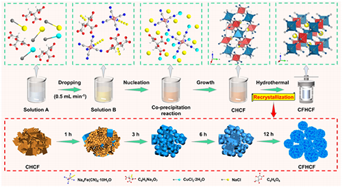 海大学乔芸、刘阳,温州大学侴术雷,华中科技大学黄云辉团队提出了一种重结晶驱动的策略,用于合成具有高度结晶性和高振实密度(0.992 g cm–3)的单斜相普鲁士蓝类似物(CFHCF)。