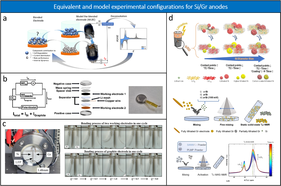 围绕上述失配与耦合行为,论文系统总结了三类关键研究路径:原位与操作态表征(如 XRD、Raman、NMR 及多尺度成像)用于直接揭示硅与石墨在循环过程中的结构演变与锂空间分布;等效与并联电极构型则通过电流分离与参比设计,实现对硅与石墨各自电化学响应和电流分配的定量解析(图5);多尺度建模进一步从颗粒到电极层级刻画锂迁移、电位分布与应力场之间的耦合关系。这些方法共同构成了研究混合负极反应失配问题的核心工具箱。