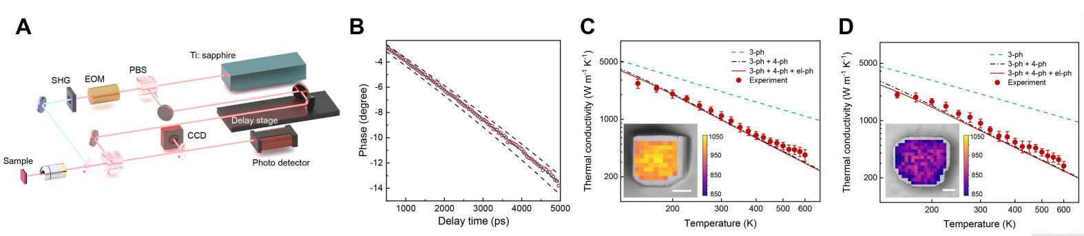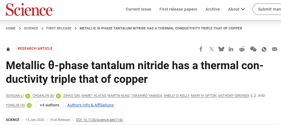 由加州大学洛杉矶分校胡永杰教授团队领衔的研究,针对金属材料导热性能长期受限的科学难题,成功合成出高质量单晶θ相氮化钽(θ-TaN),并系统表征了其热输运性能与微观机理。研究团队采用助熔剂辅助的置换反应法,克服了传统高压合成难题,获得了毫米级高纯单晶。实验测得θ-TaN在室温下的热导率高达约1100 W·m–¹·K-1,是铜的三倍,创下金属材料导热性能新纪录。通过非弹性X射线散射与超快光谱技术,团队揭示其高导热源于大声子带隙、声子成簇效应及极弱的电子-声子耦合,这些特性共同抑制了声子-声子散射,实现了声子主导的高效热输运。该研究不仅验证了第一性原理预测,也为高性能电子散热、航空航天热管理等领域提供了新材料范式。相关成果以《Metallic θ-phase tantalum nitride has a thermal conductivity triple that of coppe》为题,近期发表在Science杂志上。