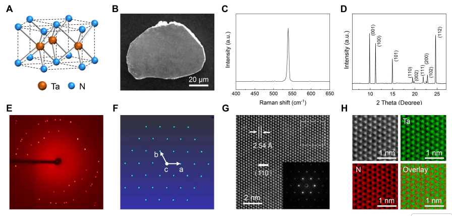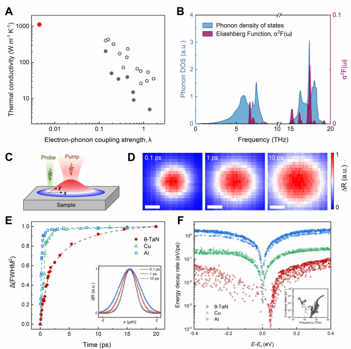 在当今高性能计算、人工智能芯片与功率电子器件迅速发展的背景下,高效热管理已成为制约设备性能、可靠性与能效的关键瓶颈。传统金属材料如铜,其热导率长期被限制在约400 W·m⁻¹·K⁻¹左右,这一极限源于金属内部强烈的电子-声子耦合与声子非谐相互作用,导致热载流子寿命大幅缩短。近年来,第一性原理计算预言某些亚稳态过渡金属氮化物可能具备突破这一极限的潜力,其中θ相氮化钽(θ-TaN)因具备超硬原子键合、低声子非谐性与极弱的电子-声子耦合而被视为极具潜力的候选材料。然而,受限于其高压高温合成的困难与多相竞争,高质量单晶θ-TaN的制备与性能验证一直未能实现,其超高导热性能长期停留在理论预测阶段。因此,实现θ-TaN单晶的可控制备并实验验证其热输运特性,不仅是对理论的重要检验,也为开发下一代高热导金属材料提供了关键实验依据。