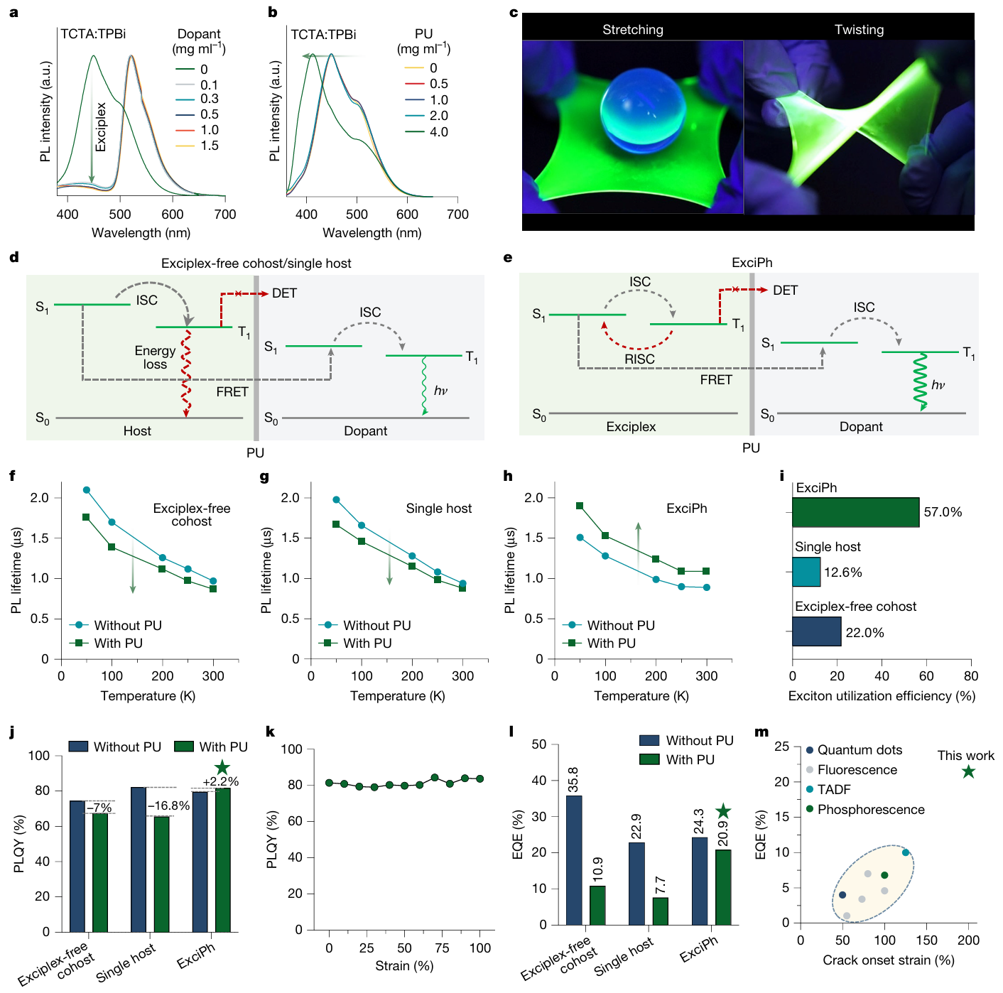 研究团队设计并制备了一种新型可拉伸发光层,核心是激基复合物辅助磷光结构(ExciPh),由磷光掺杂剂Ir(ppy)₂acac、激基复合主体材料(TCTA与TPBi)以及聚氨酯(PU)弹性体基质构成。该体系的独特之处在于其“弹性体容忍的三重态回收机制”:即使PU作为绝缘基质会阻碍短程的Dexter能量转移,激基复合物仍能通过有效的反向系间窜跃(RISC)将三重态激子转换为单重态,再通过长程Förster能量转移至磷光掺杂剂发光。这一机制使发光层在实现超过200%拉伸率的同时,仍能维持高达57.0%的激子利用效率,并在刚性电极器件中获得21.7%的外量子效率。