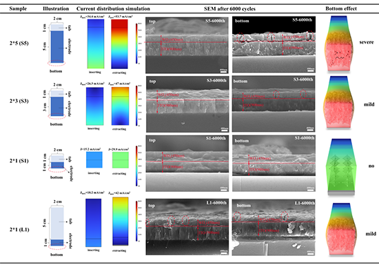 2. 提出“末端反射模型”:创新性地将电流在集流体末端的行为类比为水流的物理反射,揭示了底部电流密度异常波动导致离子“易进难出”的内在机制。