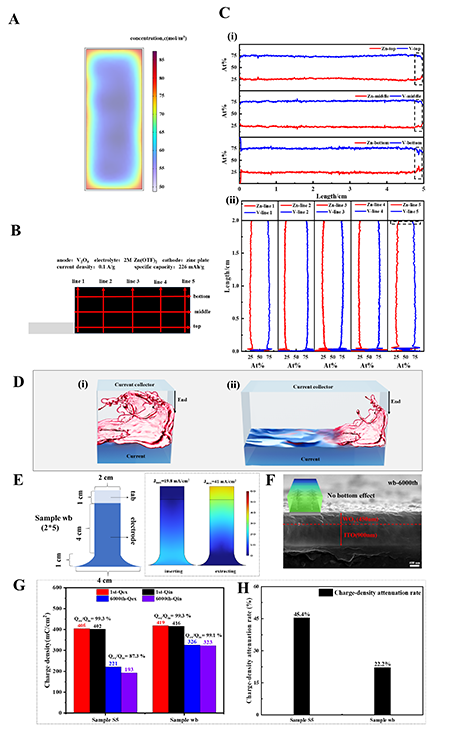- Na+-WO3-y电致变色体系的XPS深度剖析;(b-c) Zn2+-MnO2和Zn2+-V2O5软包电池的全尺寸XRF线扫描分析。数据证实,随着器件尺寸增大,离子在底部的堆积浓度显著高于顶部和中部,证明了该效应的普遍性。