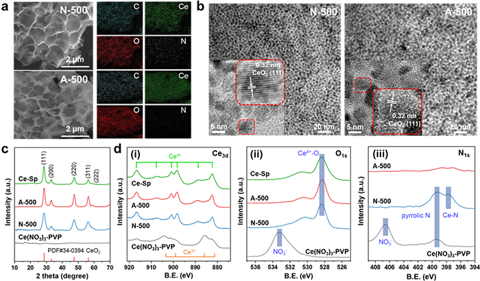 本研究开发了一种简易、可规模化生产的一步制备法,通过高温下煅烧Ce(NO3)3与聚乙烯吡咯烷酮(PVP)混合物,制得了镶嵌于多孔碳基框架中的超小CeO2纳米颗粒。所得样品标记为 N/A-X,其中 N/A表示煅烧氛围(氮气/空气),X代表煅烧温度。以500 °C焙烧得到的样品为例,在N2氛围中,源自NO3⁻和PVP的氮大部分得以保留,并转化为吡咯氮和Ce-N物种。而在空气氛围下煅烧时,受氧化环境影响,混合物中所有氮源均被完全移除。