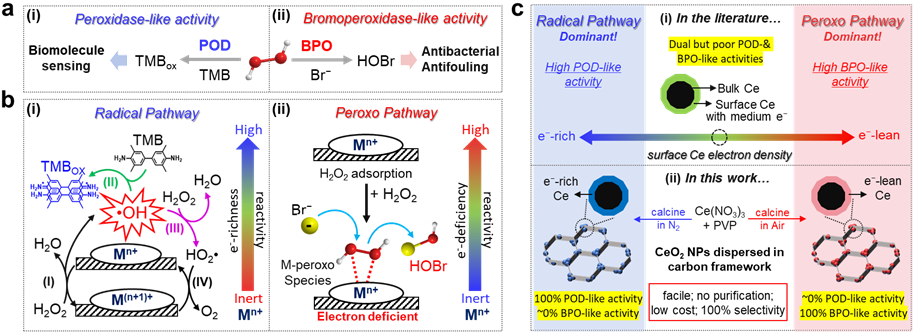 纳米酶因成本低、稳定性好,是天然酶的有前景的替代品,已应用于医疗、环境等领域。但多数纳米酶缺乏特异性,常同时表现出多种酶活性(如类POD和BPO活性),导致底物H2O2被竞争消耗,降低实际应用效率(示意图1a)。 研究表明, 类POD活性依赖“自由基途径”,与活性位点电子密度正相关(示意图1b(i))。相反的,类BPO活性则依赖“过氧化物(peroxo)途径”,与活性位点缺电子程度正相关(示意图1b(ii))。而CeO2纳米酶中具有中等电子密度的Ce活性位点,将同时具有两种活性路径,从而限制了其催化活性(示意图1c(i))。文献中常用X射线光电子能谱(XPS)中Ce3+/Ce4+的比例关联活性,但该方法存在明显的局限性。一方面,采用铝源(1486.6 eV)激发的Ce3d光电子逃逸深度可达约7 nm,已超过我们合成的超小CeO2纳米颗粒(约4 nm)的尺度,从而引入了来自亚表面/体相Ce信号的干扰。另一方面,XPS Ce3d仅能提供离散的氧化态,无法反映由局域环境所致的连续电子密度变化。最近,我们课题组利用探针辅助核磁共振(NMR)技术解决了这些局限。我们发现,调控活性位点电子密度至较高或较低水平,可抑制其中一条途径,从而显著提升另一途径的活性和特异性。但现有表面修饰方法制备与纯化步骤繁琐、产率低、成本高,难以规模化。因此,亟需开发简便、可规模化制备的纳米酶,通过精准调控电子密度实现单一H2O2活化途径(示意图1c(ii)),从而在检测、抗菌等应用中达到最佳性能。