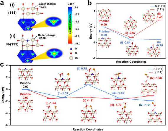 图4. (a) 替换表面氧原子为氮原子 (i) 之前与 (ii) 之后的CeO2 (111) 晶面的俯视图。原始 (111) 面与氮掺杂 (111) 面上 (b) 形成表面peroxo物种并释放·OH自由基的能量分布图,以及 (c) 形成O桥接的溴物种并产生HOBr的能量分布图。