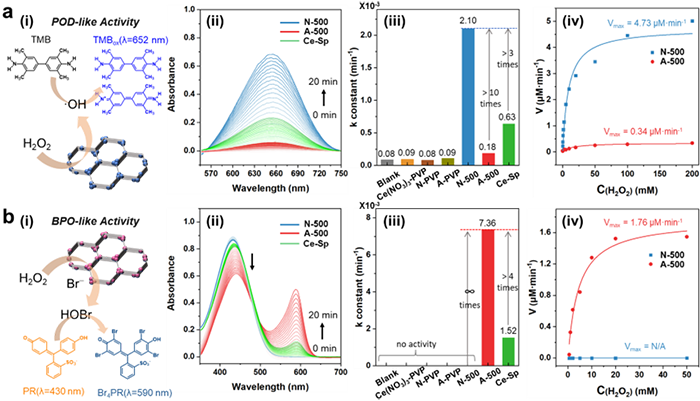 图2. 样品的 (a) 类POD活性与 (b) 类BPO活性,以及对应的 (i) 示意图、(ii)随时间变化的UV-Vis光谱、(iii) k常数和 (iv) 不同H2O2浓度下的反应速率。