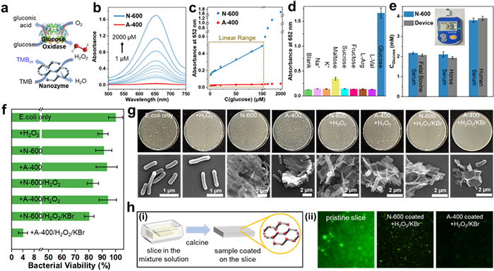 图7. (a) 葡萄糖检测示意图。(b) UV-Vis光谱图及 (c) N-600与A-400作为POD模拟物对葡萄糖浓度的响应。(d) N-600作为POD模拟物的选择性测试,以及 (e)我们的方法与商业葡萄糖监测设备对血清样品中葡萄糖水平测试的比较。(f) 不同条件下大肠杆菌的存活率和 (g) 对应的实物照片与SEM图像。(h) (i) 铁片上负载样品的制备示意图及 (ii) 其暴露于绿色荧光蛋白标记大肠杆菌悬浮液中的实验结果。