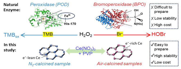 近期,香港城市大学彭咏康教授团队在Chemical Engineering Journal上发表了题为“Fine-Tuned Ce Electron Density Directs H2O2 Activation Pathway in Industrially Employable CeO2 Nanozymes for ~100% Specificity and Boosted Activity in (Bromo)peroxidase Mimicking”的研究论文。该工作通过简单的煅烧法实现了氧化铈基纳米酶的大规模合成,具备工业化生产潜力。并通过调控表面铈活性位点的电子密度,实现了H2O2活化路径及相关(溴)过氧化物酶模拟反应特异性的控制。