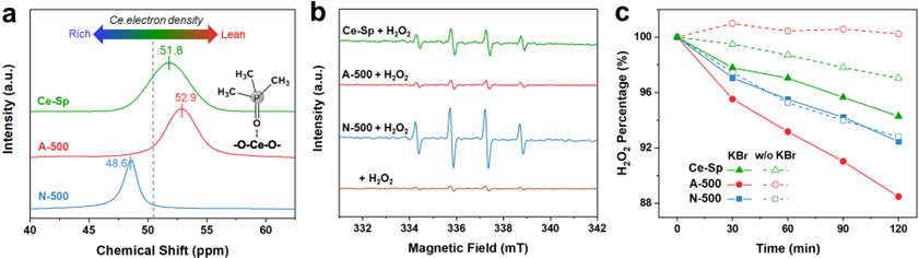 通过TMPO作为探针的31P NMR、电子顺磁共振(EPR)以及H2O2分解实验结果分析,我们揭示了表面Ce电子密度与催化活性之间的构效关系。N-500表现出的专一类POD活性源于其Ce-N物种所关联的富电子Ce位点,这些位点能有效地将H2O2还原为·OH自由基。相比之下,在空气氛围中制备的A-500具有缺电子Ce位点,这抑制了H2O2的还原过程,促进了利于Br⁻氧化的Ce-peroxo物种的形成,从而表现出高的类BPO活性。由于Ce-Sp表面Ce位点具有中等电子密度,使得H2O2能通过双反应路径被活化,但因其缺乏反应特异性,导致类POD与类BPO活性均处于较低水平。
