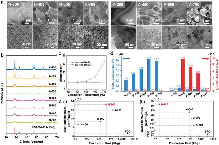 图5.在氮气/空气氛围中不同温度下制备所得样品的 (a) SEM(上图)与TEM(下图)图像,以及其 (b) XRD谱图。这些样品中 (c) CeO2纳米颗粒的尺寸分布,及其 (d) 对应的类POD(蓝色柱)和类BPO(红色柱)反应的k常数。(e) (i) 氮气煅烧与 (ii) 空气煅烧样品的预估生产成本及性价比分析。