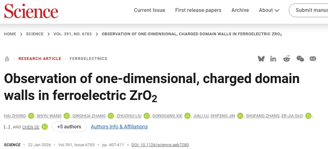 原文信息:Hai Zhong et al. ,Observation of one-dimensional, charged domain walls in ferroelectric ZrO2. Science 391, 407-411 (2026).