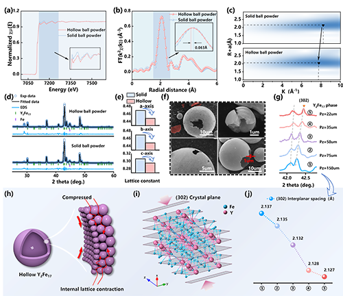 研究团队采用气雾化法制备了具有高化学纯度和球形形貌的空心及实心Y2Fe17颗粒。由于快速凝固过程中的表面优先凝固和固-液密度差,液滴内部形成压力梯度并最终形成空腔,导致内壳层积累了显著的残余压应力。XRD结果表明空心颗粒发生高角度偏移,HRTEM进一步证实了内壳层存在多晶畴和显著的晶格畸变,这种应力诱导的结构特征为后续的各向异性调控奠定了基础。