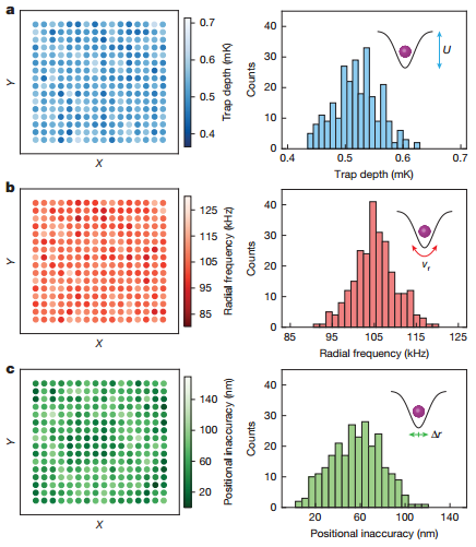 研究人员还表征了16×16阵列的均匀性。研究人员使用捕获的原子作为高灵敏度探针来测量每个捕获的深度、频率和位置。结果表明:对于陷阱深度和径向陷阱频率,研究人员发现整个阵列的标准偏差分别为 7.5% 和 5%(8%)。与4 μm的陷阱间距相比,位置误差在1.5 %的水平上,与Sr的陷阱内振动波函数的程度相似。这种均匀性水平不仅媲美甚至超越了传统光镊技术,更为后续量子操控的一致性提供了保障。