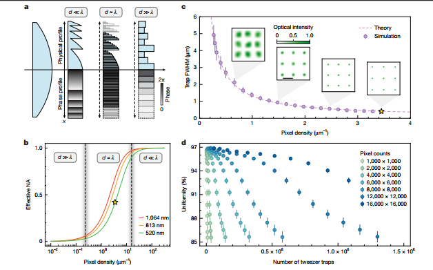 光镊阵列正在为量子应用带来深远的影响,它现已成为量子计算、量子模拟和量子计量的关键实验平台,实现了对单个原子和分子前所未有的控制水平。光镊阵列由许多紧密聚焦的激光束组成,每束激光束构成单个粒子的陷阱。光镊阵列生成的关键标准包括阵列几何形状的高度灵活性、陷阱均匀性和可扩展性。此外,紧凑性、稳定性和高光学效率也需具备。目前,光镊阵列主要通过有源光束整形器件产生,例如声光偏转器、液晶空间光调制器或数字微镜器件等。但这些设备需要复杂的控制电子设备和具有高数值孔径的投影光学器件,对未来的量子应用具有显著局限性。尽管科学家已经探索了一些替代技术,但有限的光束整形能力使得实现高度均匀的阵列仍具有挑战性。值得注意的是,超表面(Metasurfaces)为光镊阵列的生成提供了一种有趣的替代方案,它是一种由亚波长尺度的人造纳米结构(被称为“超原子”)组成的二维平面光学器件。