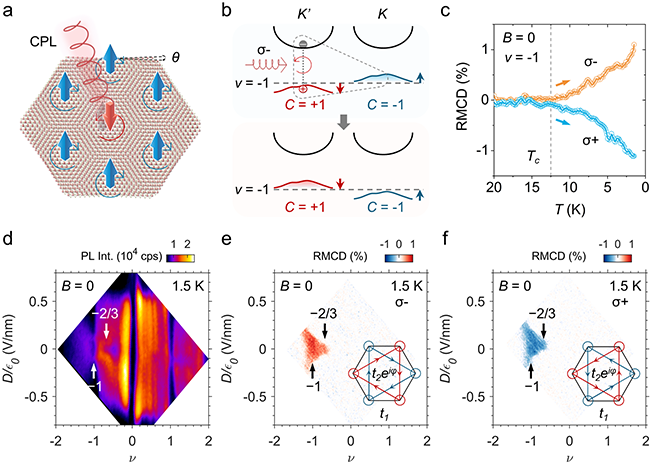 故事的转折点,来自过渡金属硫族化合物固有材料属性的启发:其强自旋轨道耦合使得MoTe2自旋与能谷自由度锁定,从而让右旋(σ⁺)与左旋(σ⁻)圆偏振光能分别耦合能带结构中的K与K′能谷。更重要的是,MoTe2扭转双层莫尔超晶格体系的平坦陈能带(Chern Band)兼具自旋—能谷锁定(Spin-Valley Locking)与自发时间反演对称性破缺(Spontaneous Time-Reversal Symmetry Breaking),使得光学“自旋泵浦(Spin-Pumping)”方案成为可能。这意味着圆偏振光的角动量可以被体系有选择性地吸收并转化成可累积的自旋/能谷不平衡,从而改变系统磁序。如图1所示,3.50°扭转MoTe2双层器件(双栅结构独立调控填充因子ν与面外电场D/ε₀)在零外磁场的降温过程中,微弱σ⁺或σ⁻圆偏振光照射成功选择性地诱导体系初始化为相反磁化方向的ν=-1和-2/3整数和分数陈绝缘态,并展现与传统外磁场诱导“训练”一致的相转变温度。