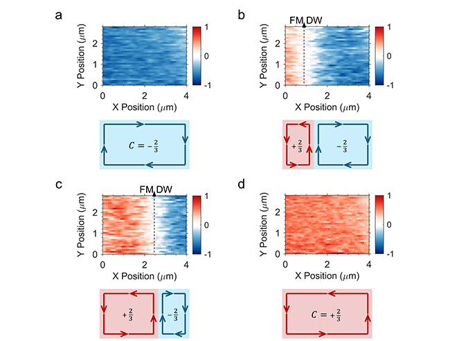 “按需设计量子物质与拓扑器件”是拓扑绝缘体和量子材料领域耕耘者期许已久、实现产业落地的宏伟目标。在莫尔陈铁磁体中,量子反常霍尔效应由陈数与无耗散手性边缘电流共同表征,而边缘电流方向由磁化方向决定。当两侧磁化相反时,拓扑数必须在畴壁处不连续变化,因此在畴壁上出现具有预设量子电导的手性通道。因此,如图4所示,这篇工作没有停留在“翻转一个整体磁化”,而是进一步利用泵浦光学技术的高空间精度与稳定可控性,在分数陈绝缘体中,通过σ⁺/σ⁻的扫描写入,把磁畴壁从左向右“推移”,从而操控陈结内边缘电流的配置,原位操纵一维拓扑畴壁的生成、移动和湮灭。