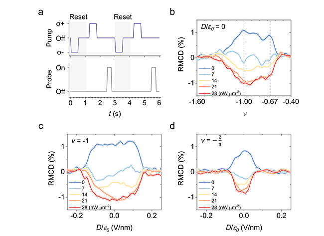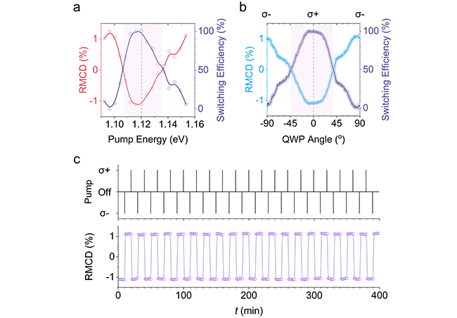 团队设计了一个简易的泵浦—探测时序实验:先在每个循环中用σ⁻ CPL初始化,再用可调功率的σ⁺ CPL触发翻转,随后用弱探测光的磁圆二色性(RMCD)读出磁态(RMCD符号与幅度分别对应磁化方向与强度)。如图2所示,在没有σ⁺泵浦时,RMCD在ν=−1和−2/3处出现明显增强,体现关联效应促进的零场铁磁序。超低功率的σ⁺ CPL便能直接抑制、进而翻转关联铁磁态,并随功率上升至28 nW·µm⁻²而饱和。被σ⁺ CPL“写入”的磁态并不会随泵浦结束而消失,而是体现一级相变的特征。图3进一步展示了这种零场磁态操控效率还强烈依赖于泵浦光子的能量与偏振态,同时可以稳定实现重复、双向的磁态切换,说明其机制不同于逆法拉第效应(IFE)或激子辅助的交换机制。