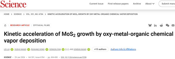 原文详情:Kinetic acceleration of MoS2 growth by oxy-metal-organic chemical vapor deposition (Science 2026, 391, 494-498)