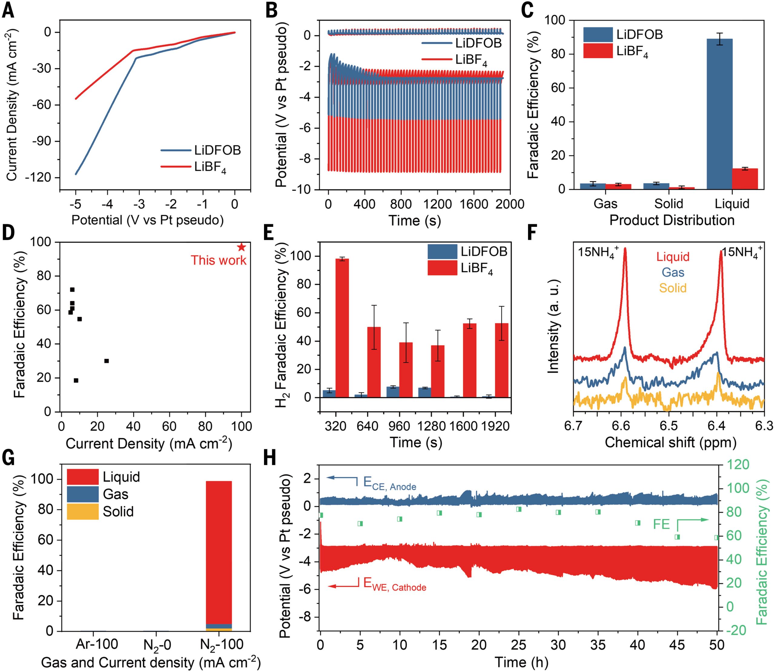 图4. 100 mA cm-2下锂介导氮气还原合成氨的电化学性能。© 2026 AAAS