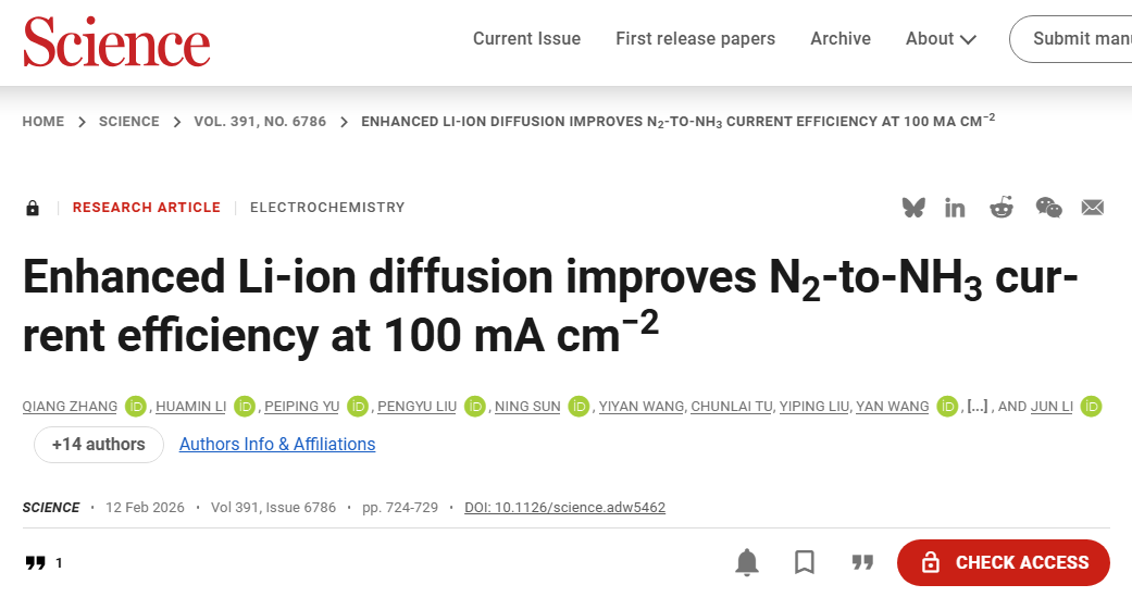 原文信息:Qiang Zhang et al. ,Enhanced Li-ion diffusion improves N2-to-NH3 current efficiency at 100 mA cm−2. Science 391, 724-729 (2026).