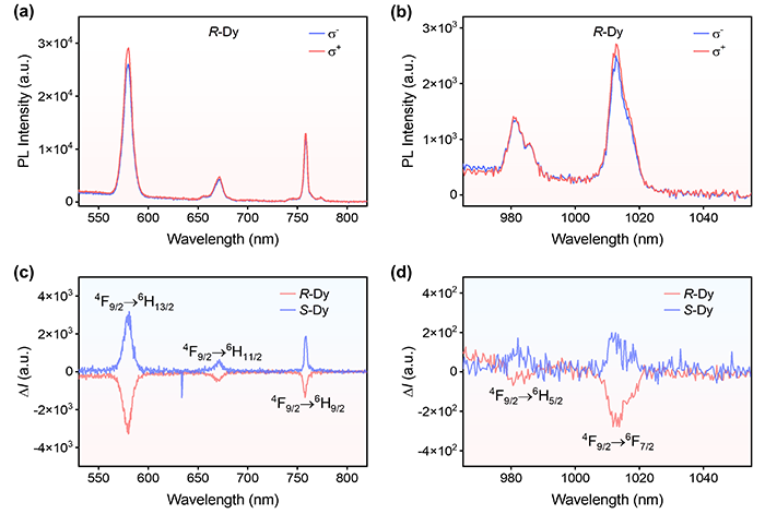图4 a, b. R–Dy在可见光区和NIR区的圆偏振发光光谱。c, d. R–Dy和S–Dy在可见光区和NIR区的圆偏振发光强度。