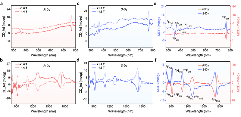 图3 a, b. 外加磁场下R–Dy在紫外-可见-近红外的表观圆二色性吸收光谱。c, d. 外加磁场下S–Dy在紫外-可见-近红外的表观圆二色性吸收光谱。e, f. R–Dy和S–Dy在紫外-可见-近红外的磁圆二色性光谱。
