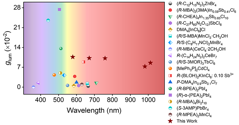 图5 已报道的手性有机-无机杂化金属卤化物钙钛矿与本研究中R–Dy的glum比较。