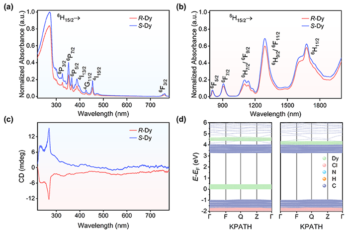 图2 a, b. R–Dy和S–Dy的紫外-可见-近红外的吸收光谱。c. R–Dy和S–Dy的圆二色性吸收光谱。d. R–Dy的能带结构。