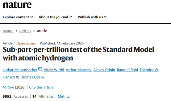 原文信息: Maisenbacher, L., Wirthl, V., Matveev, A. et al. Sub-part-per-trillion test of the Standard Model with atomic hydrogen. Nature (2026).