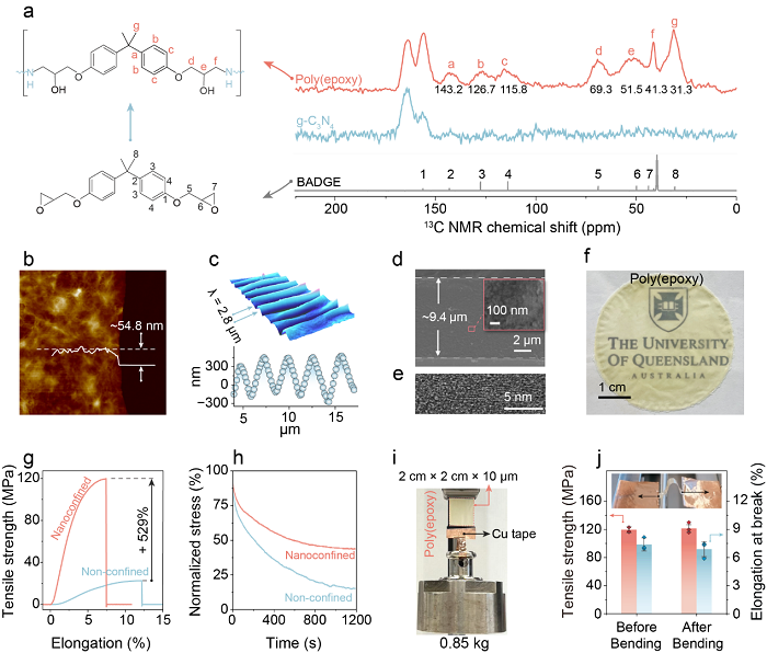 图2展示了 NCP 诱导的力学增强证据链,覆盖“纳米厚度—微米厚度—宏观演示”。膜的厚度可调范围非常宽:50 nm 到 20 µm;其中 50 nm 膜在保持完整结构的同时,通过起皱/屈曲法估算的杨氏模量为 2.84 GPa。微米级膜(代表厚度 9.4 μm)的截面电镜显示致密堆积、近乎无孔洞(void-free)结构;通过调控 g-C₃N₄/PEI 负载与环氧树脂交联剂浓度,膜达到抗拉强度119.9 MPa、杨氏模量3.2 GPa,相对非限域对照分别提升 529% 与 958%。宏观演示与耐疲劳:10 µm 膜(2×2 cm)可无支撑承载 0.85 kg;经历 100,000 次弯折后仍保持力学完整性,并且在 1% 初始应变下表现出更强的抗形变能力(应力松弛对比)。这说明了 NCP 并不是“把膜做厚”换强度,而是通过孔道限域导致的网络致密化与结构规整化,使得材料在极薄尺度依然具备接近工程材料的刚度与强度,并同时具备显著的抗疲劳弯折能力。